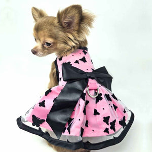 Your pup will look simply charming in this small dog dress designed for elegance and comfort. The All Aflutter dress features a soft pink body with black trim, a sweet black bow, and a delicate butterfly overlay that gives it a touch of whimsical style.