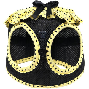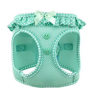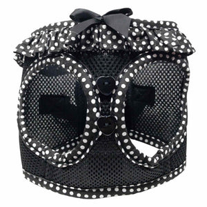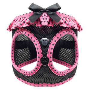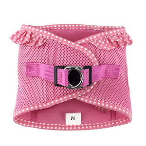 This version of our popular American River step-in dog harness vest is dressed up with polka dot trim, a little ruffle, and two decorative heart-shaped buttons. Smiles will light up when people see your little gal strut her stuff in this harness!